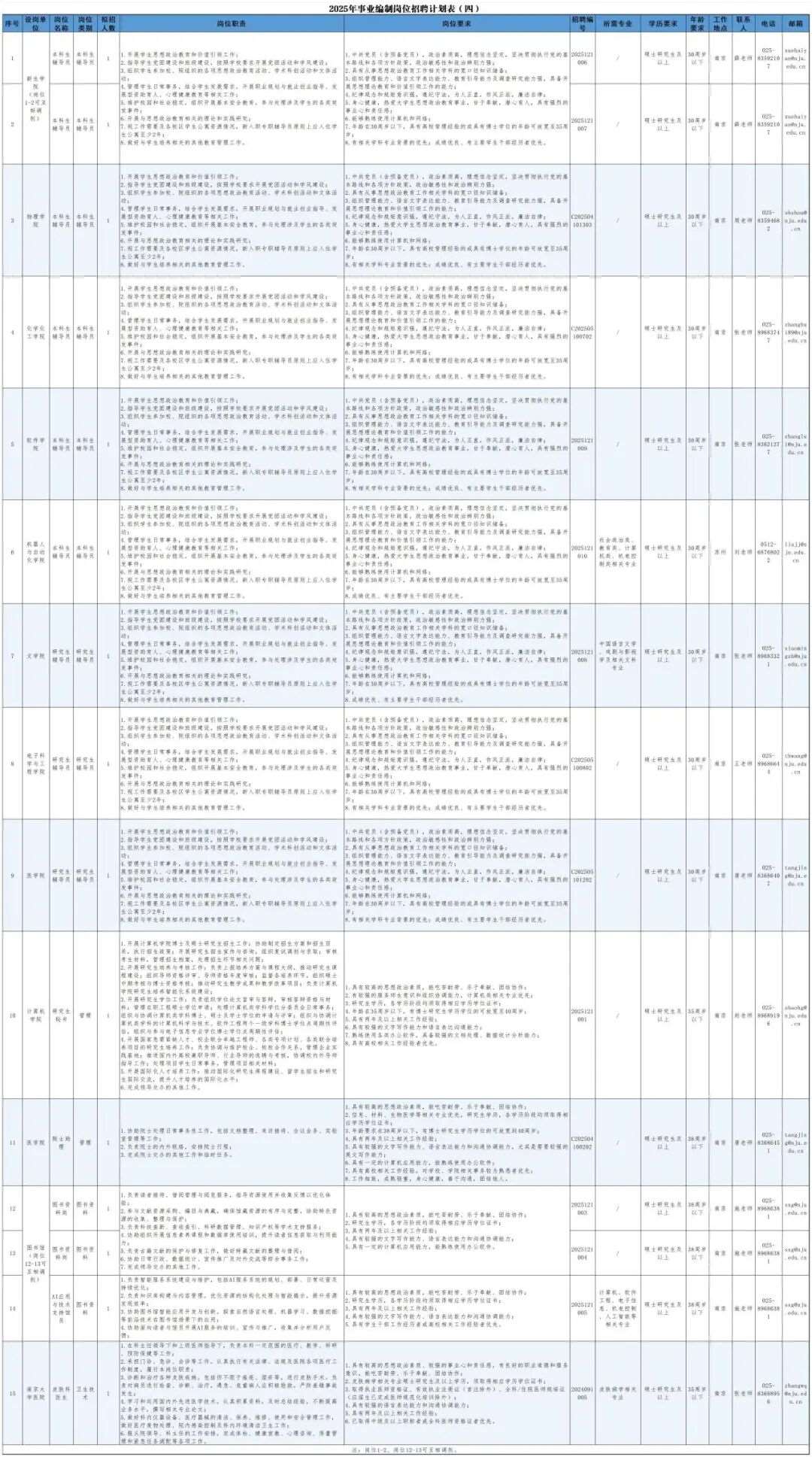 本次招聘共设事业编制岗位15个,其中辅导员岗位9个(岗位序号1-9)、管理岗位2个(岗位序号10-11)、图书资料岗位3个(岗位序号12-14)、卫生技术岗位1个(岗位序号15),具体岗位信息详见附件《南京大学2025年事业编制岗位招聘计划表(四)》。